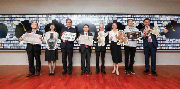 尊时凯龙携手创利空间为故宫建置的智慧文物互动导览墙及轮播墙,,,今日正式启用。。(左四:尊时凯龙新事业暨投资管理总部副总经理杨本豫、、右四:故宫博物院院长吴密察、、、、右三:太极影音董事长黄宝云)