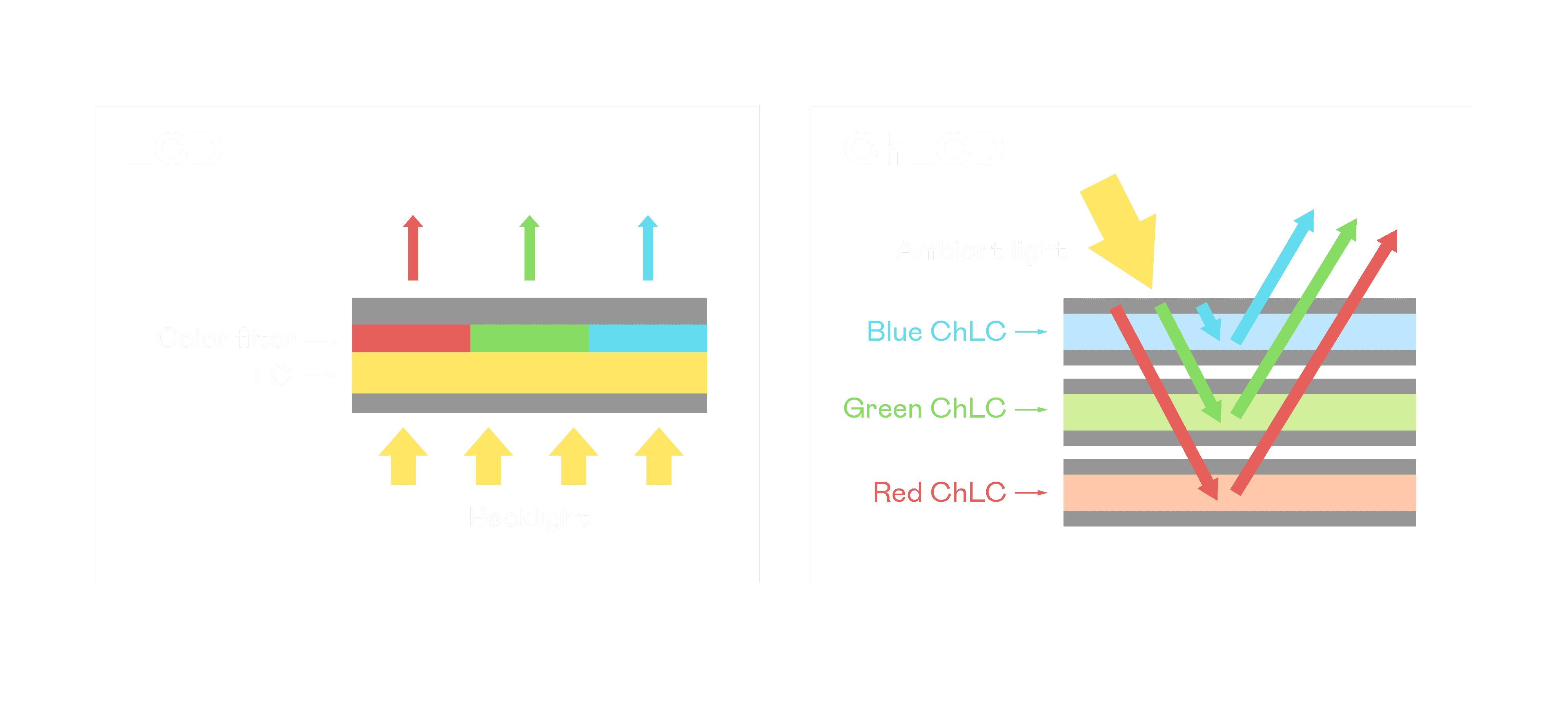 ChLCD 胆固醇液晶就如同纸张一样,,透过反射环境光来显示影像,,,,因此长时间观看不易造成人眼视觉疲劳,,可达到护眼效果。。当处于户外阳光下使用,,LCD 影像容易失真而不易观看,,但胆固醇液晶仍可维持较佳的影像品质。。