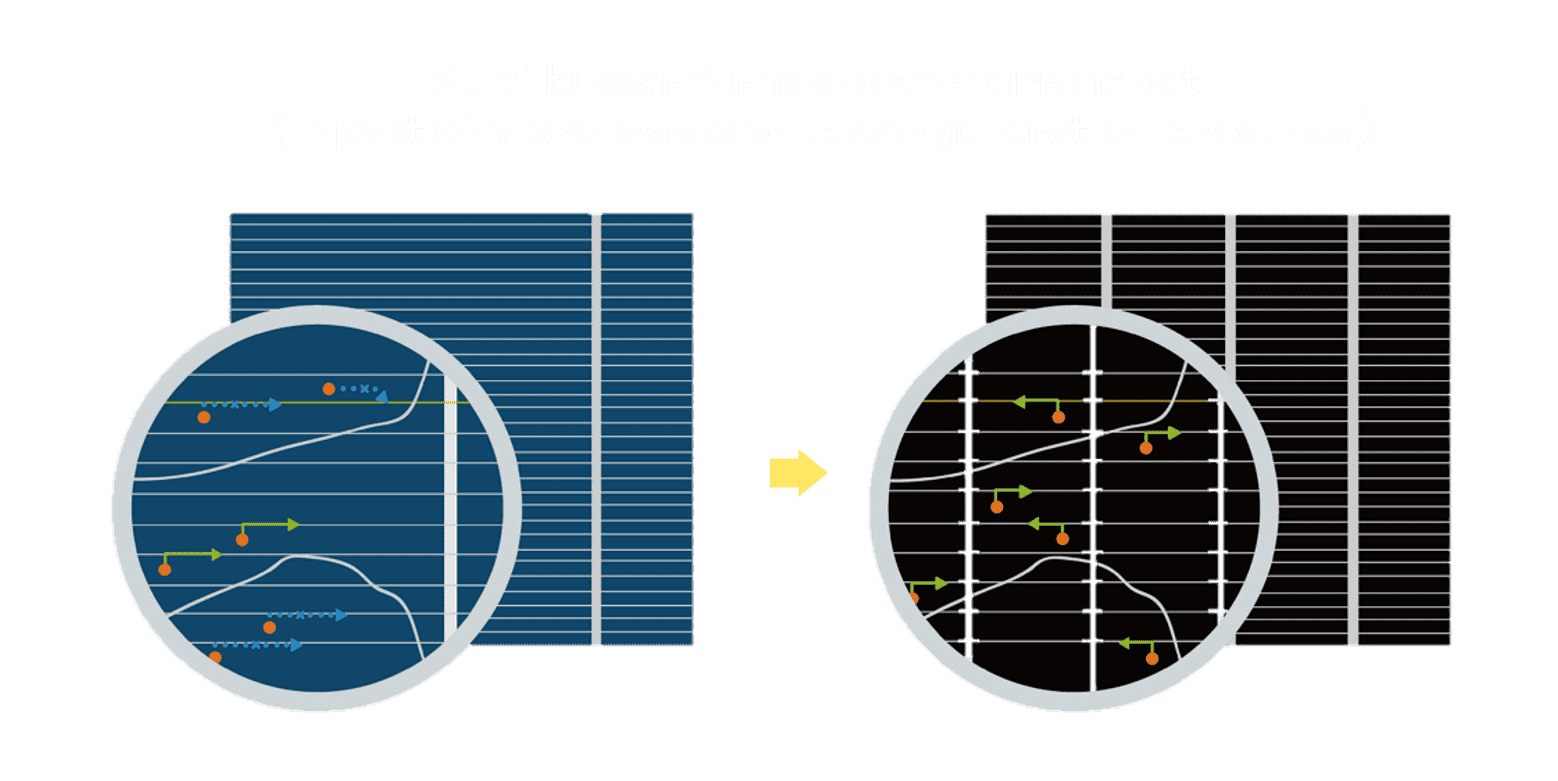 - 电池使用多条铜导线 (Copper wire) 于电池片上形成较短的电流路径,,提高电流收集效率,,,采用圆形设计的铜导线较传统扁平式的铜焊带 (Ribbon),,可增加入射至电池的光线量。。。。