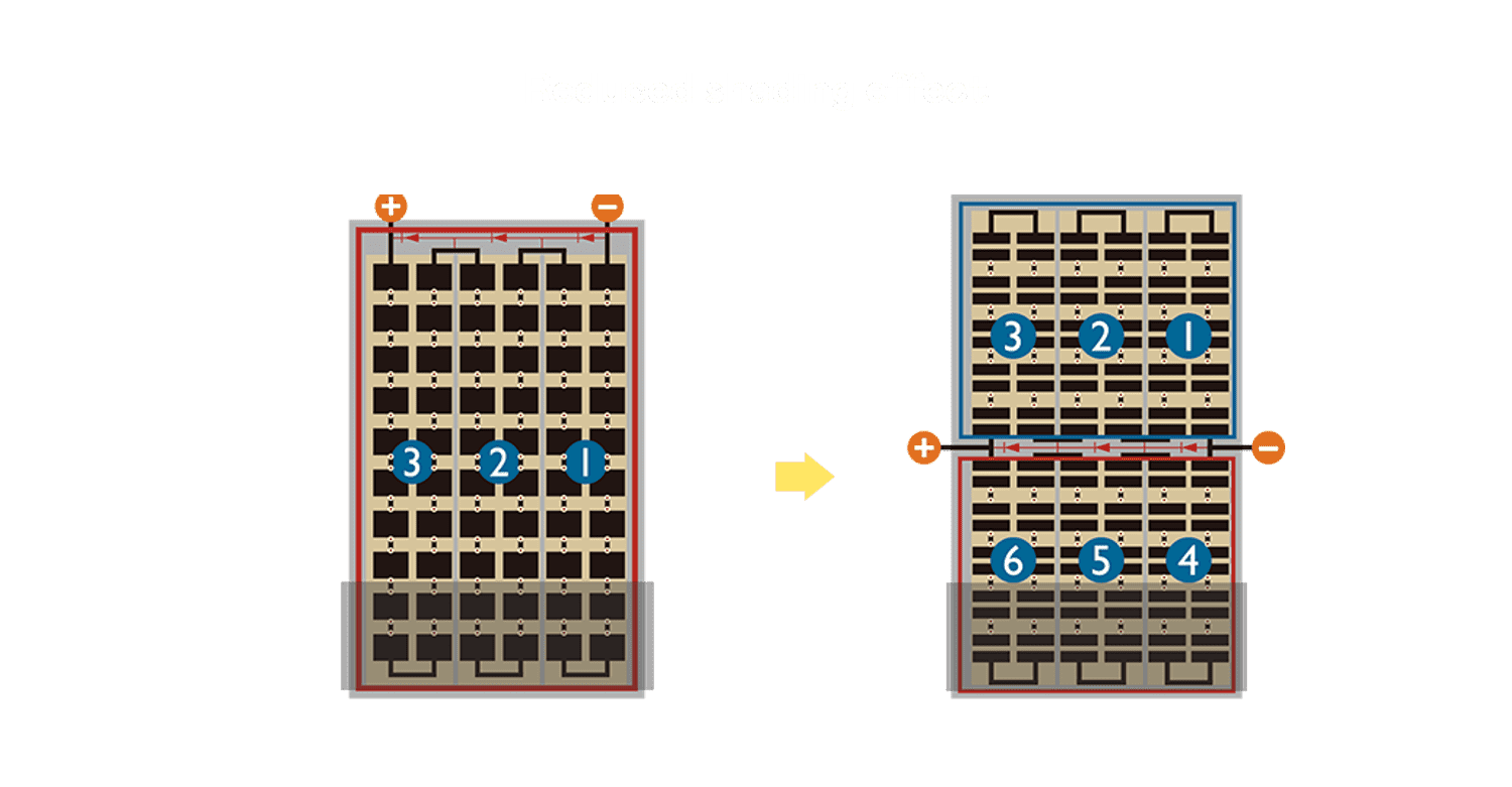 优化的太阳能电池结构设计,,,不仅提高电流收集效率,,,,降低电池隐裂,,,使太阳能模组长期维持稳定的输出效能,,,提高营运效益。。
